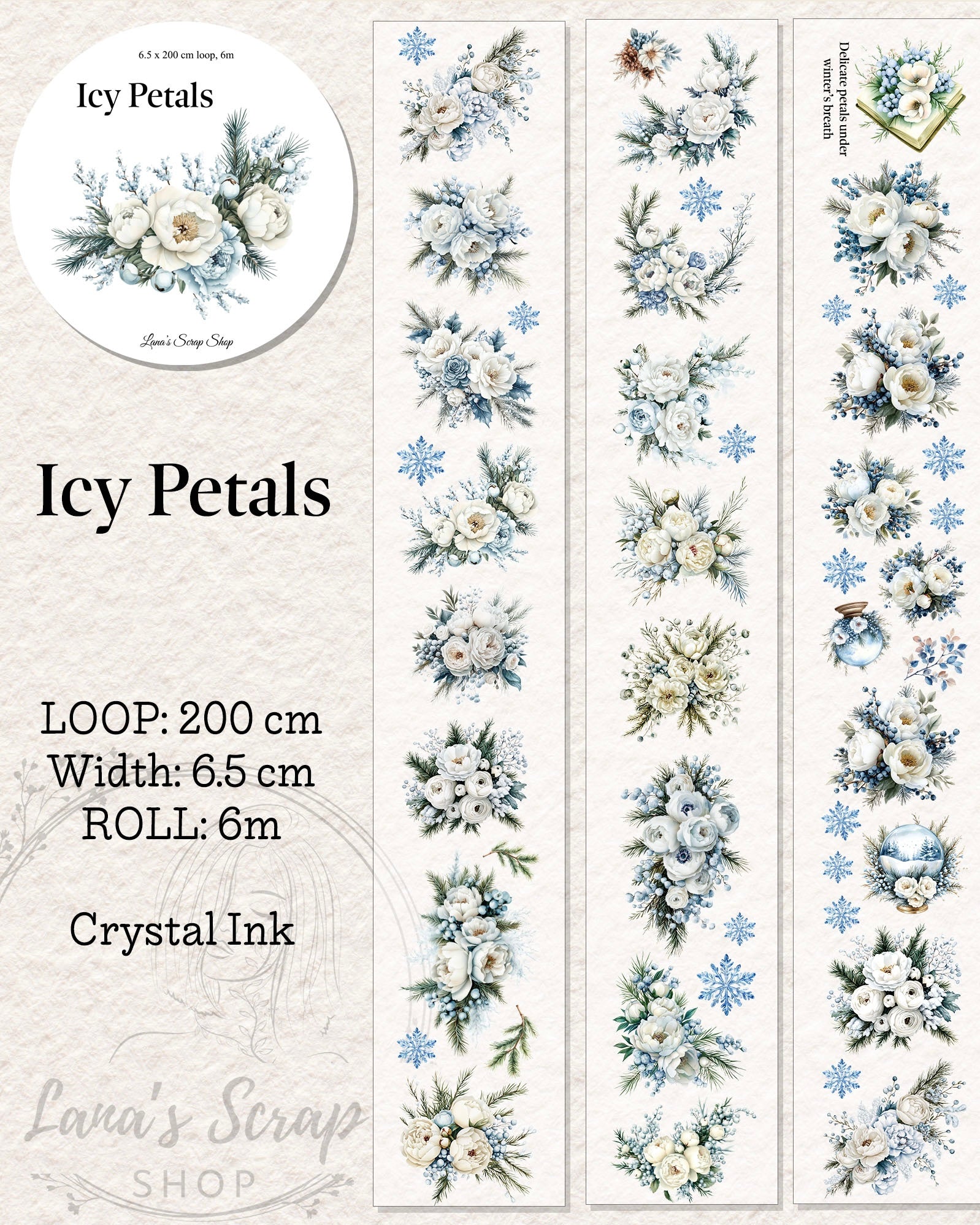De rol is 6 meter lang en 6,5 cm breed. De loop is 2 meter lang. De pettape is als rol en als loop verkrijgbaar. De pettape is gemaakt met prachtige crystal inkt.