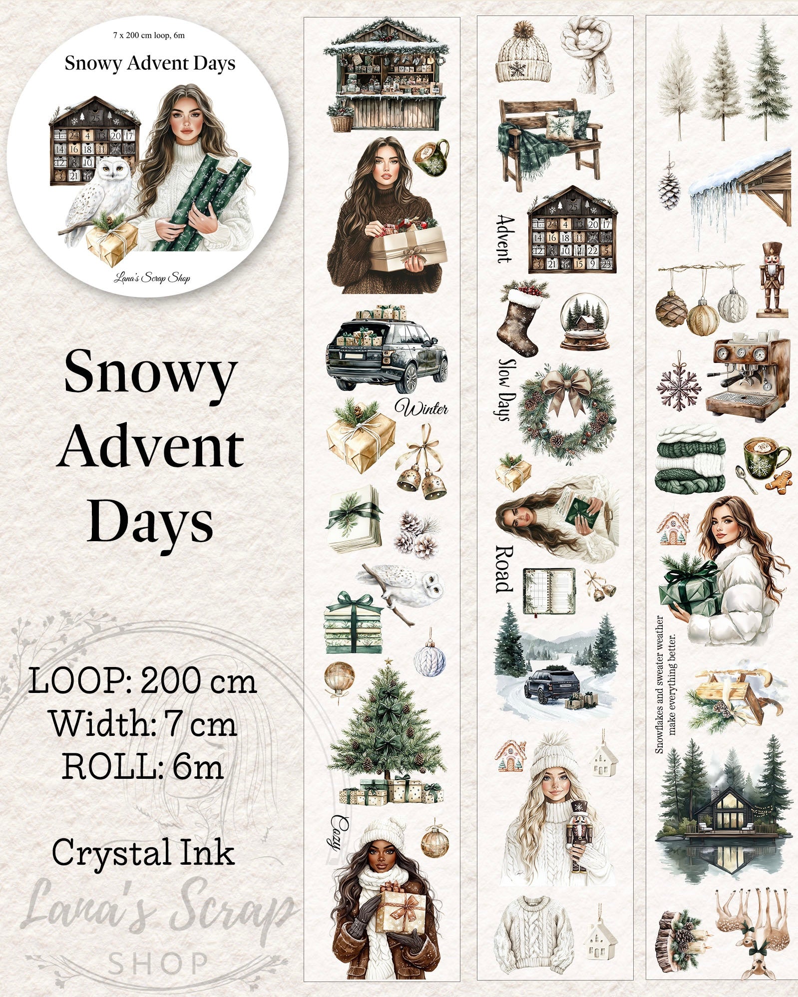 De rol is 6 meter lang en 6,5 cm breed. De loop is 2 meter lang. De pettape is als rol en als loop verkrijgbaar. De pettape is gemaakt met prachtige crystal inkt.